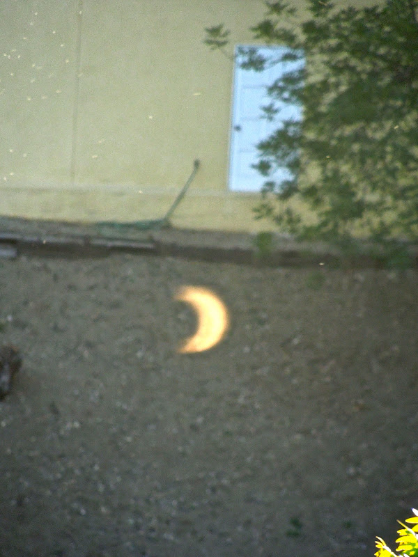 On the same day Indian skulls were in the news, the solar eclipse appeared above the western skies, at 6:38 pm, for about an hour. I'd read in the same Sunday paper that Navajo custom called for praying, fasting and staying indoors, but Tom was skeptical—historically, he wanted to know, "how would they have known when one was approaching?" For his part, he wasn't praying. In the afternoon, he set up a mirror on a grip stand to reflect the sun, and then went down below to plant sunflower seeds.